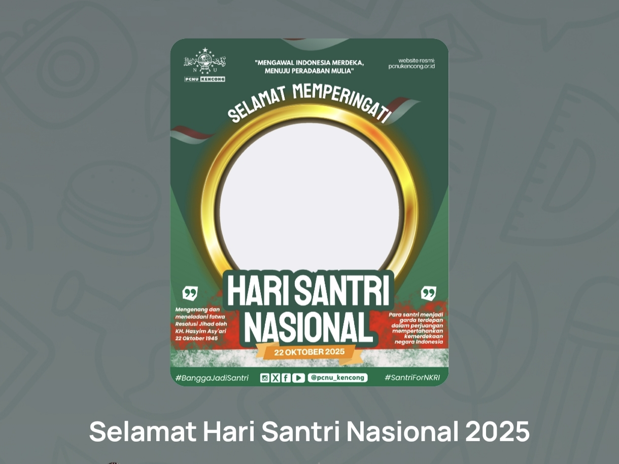 Ayo warga NU Kencong siapkan foto terbaik Anda dan mari rayakan bulan Oktober ini sebagai bulan spesial tepatnya pada tanggal 22 Oktober digelar peringatan Hari Santri Nasional 2025. Bangga jadi santri! #HARISANTRINARIONAL2025 #HSN2025 #PCNUKENCONG