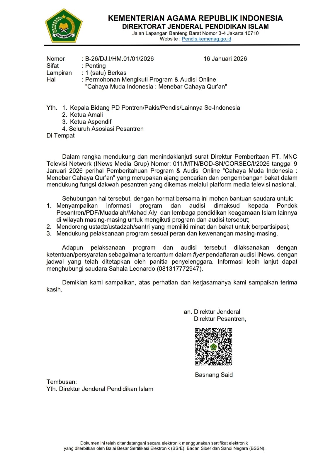 Melalui surat resmi bernomor B-26/DJ.I/HM.01/01/2026 tertanggal 16 Januari 2026, Direktorat Pesantren Kemenag RI mendorong pondok pesantren, lembaga pendidikan diniyah, hingga Ma’had Aly untuk menyampaikan informasi program ini kepada para santri serta mendorong ustadz, ustadzah, dan santri yang memiliki minat dan bakat untuk ikut ambil bagian .